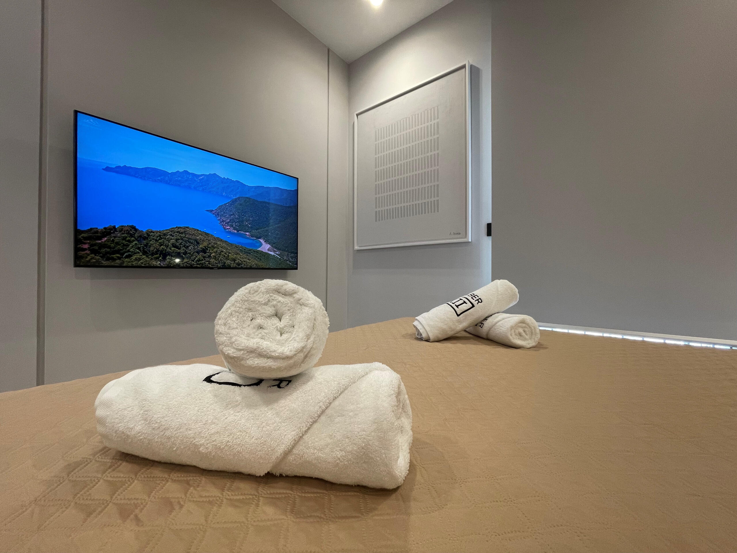 Sleep peacefully on a bespoke king-size bed, enhanced with custom pillows and premium linen. The spacious sofa bed doubles as a 2-person bed, equipped with an additional topper for maximum comfort and restful nights.